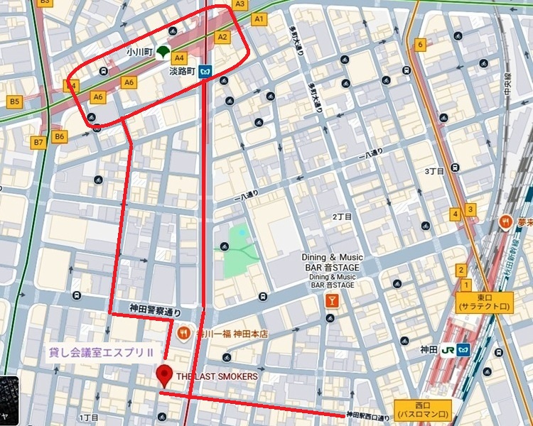 | JR神田駅 西口 → 神田駅西口通り(徒歩約5分) 東京メトロ 淡路町駅 → 国道405号沿い(徒歩約6分) A2出口 都営新宿線 小川町駅 → 国道405号沿い(徒歩約7分) A2出口 または A4・A6出口 1.神田駅の西口を出るとすぐに”西口商店街”がありますのでそこをまっすぐ進んでください。 2.約5分歩くと神田西口通りの交差点に出ます。そのまま大通りを渡ってください。 3.通りを渡るとその次の角の右手前のビルの3階(窓際に看板が出ています)がエスプリⅡになります。 ビル入り口には MIWA BLDGの表示があります。1階は喫茶店です。(LAST SMOKERS) 4.ビルの裏手に有料駐車場があります。 |