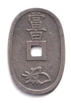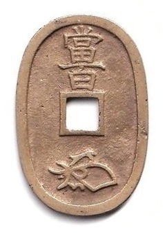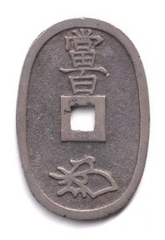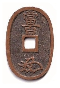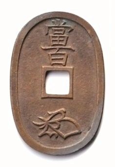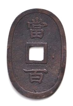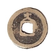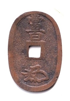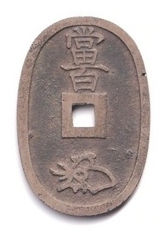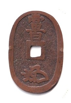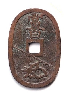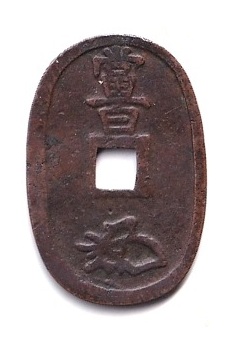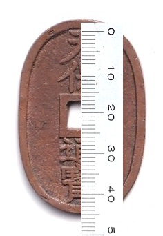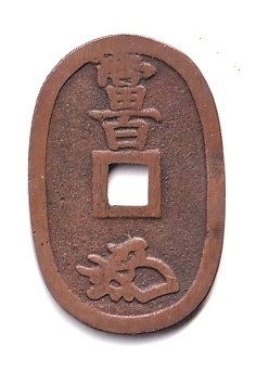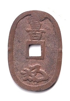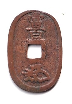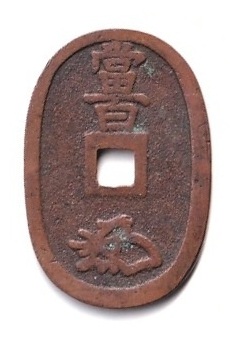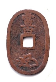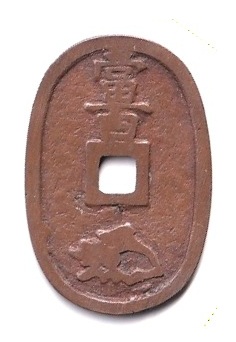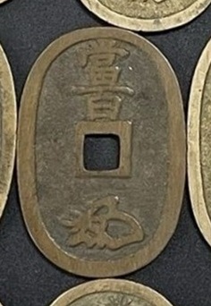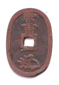 白川師の文銭カタログには名前と手書き図のみ掲載。いずれも最終画先端が陰起する形状なので、これが正合するものだと思います。ただし、交叉部に鋳だまりがあるのはご愛敬、お目こぼしを・・・。 |