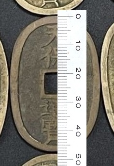 【48㎜台・45㎜台が出現しづらい理由】 大様は本座広郭を一度写しただけ。密鋳という性格から、通用銭を磨輪して母銭使用する可能性が高いので大様の発生確率は自然と低くなります。 また、磨輪母銭を使用したとしても長径45㎜台は4回の写しが必要であることが分かります。最小様が少なく別格視されるわけですね。 ※表にない長径48.20㎜未満の超磨輪母銭や、鋳造後の磨輪によるさらなる縮小もあり得ます。したがって3回写しの45㎜台もわずかにあり得ますが、右の本座広郭のような奇異な形状になると思われます。 |
